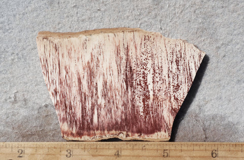 Alunite is a rock-forming sulfate mineral found in pockets or seams in volcanic rocks such as rhyolite or andesite. This material was collected in the Quartzsite area years ago. It is particularly desirable as a lapidary material because of the intense red streaks that developed in the presence of iron compounds during formation at the volcanic fumarole. This collecting area has been completely dug out and the material is only available from old collections.