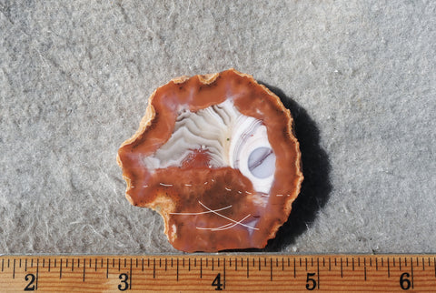 Berber agate is a unique material from Morocco. Known for its bright salmon orange/red color, it is usually accompanied with a white/gray background that many times displays a tight fortification pattern. It produces many unusual patterns and unique “needle” inclusions that makes for a great variety of finished pieces. Berber agate makes great cabbing stock….easy to polish with a wide variety of color and pattern.