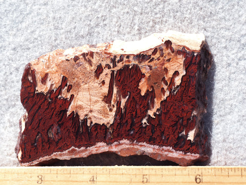 This series of slabs are recognized as Zero Hill Cady Mountain Agate. The Cady Mountains are one of the most prolific rock collecting areas in Southern California. Known for its wide variety of lapidary material, this locale produces some of the best agate/jaspers in the world including tube agate, moss agate, plume agate, sagenite and fortification agates. The brilliant dark red and orange plume/moss pattern in this slab will make striking and highly polished cabs.
