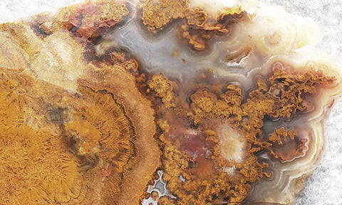 Cathedral agate from Mexico has been a long-time favorite with rockhounds everywhere. Named for its “spires” of fingerlike agate stalactites, it contains awesome plumy moss patterns with amazing detail. Normally predominantly browns and yellows, it occasionally has bright red/pink or purple accents. It makes spectacular cabs or magnificent display pieces. It has proven to be one of the keystone items in any agate collection.