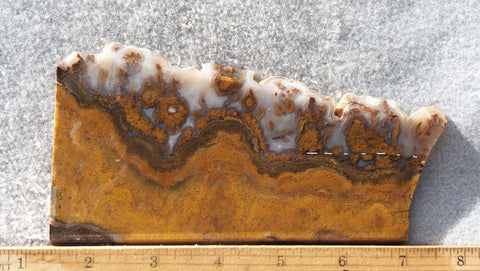 Cathedral agate from Mexico has been a long-time favorite with rockhounds everywhere. Named for its “spires” of fingerlike agate stalactites, it contains awesome plumy moss patterns with amazing detail. Normally predominantly browns and yellows, it occasionally has bright red/pink or purple accents. It makes spectacular cabs or magnificent display pieces. It has proven to be one of the keystone items in any agate collection.