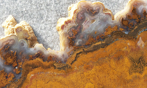 Cathedral agate from Mexico has been a long-time favorite with rockhounds everywhere. Named for its “spires” of fingerlike agate stalactites, it contains awesome plumy moss patterns with amazing detail. Normally predominantly browns and yellows, it occasionally has bright red/pink or purple accents. It makes spectacular cabs or magnificent display pieces. It has proven to be one of the keystone items in any agate collection.