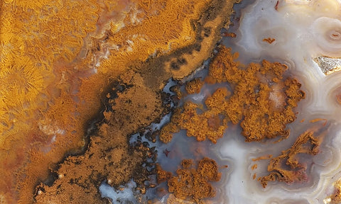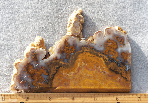 Cathedral agate from Mexico has been a long-time favorite with rockhounds everywhere.  Named for its “spires” of fingerlike agate stalactites, it contains awesome plumy moss patterns with amazing detail.  Normally predominantly browns and yellows, it occasionally has bright red/pink or purple accents.  It makes spectacular cabs or magnificent display pieces.  It has proven to be one of the keystone items in any agate collection.