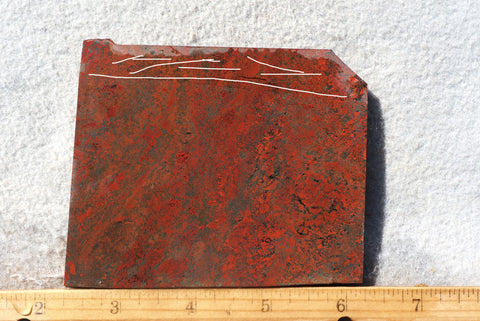 Crater Lake plume jasper is a relatively rare material that comes from Oregon. This material is noted for its intensely colored red inclusions on a dark background that are officially described as plumes. Although the term “plume” might be a bit of a stretch for proper nomenclature, it still makes for very striking finished cabs or intarsia. The rough was purchased from an old collection and was said to have been acquired many years ago. It is relatively free of flaws and takes a good polish.
