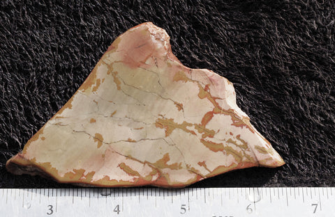 Dead Camel jasper from Nevada is a relative newcomer to the lapidary scene, but it has rapidly grown to be one of the current favorites.  It's a very hard jasper, with busy, brecciated patterns in a mix of pink, yellow and blue. The newest material contains green and maroon.  It is excellent material to work with, it takes a very glossy polish and makes one of a kind cabs.