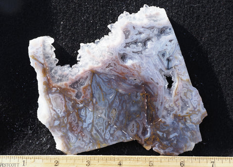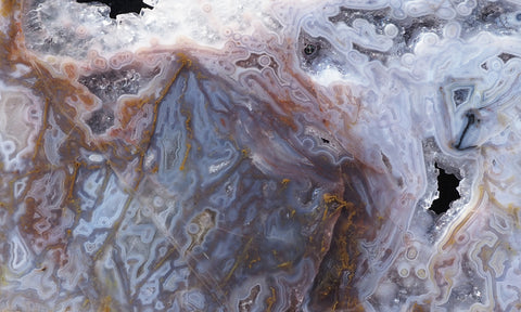 Durango Blue Agate was a new introduction from Mexico at the 2024 Tucson Rock Show. It is characterized by its soft blue/lavender or pink hues and its multitude of tubular and lacey inclusions, as well as beautiful drusy pockets. This agate will make extraordinary jewelry pieces and will finish with a superior polish.