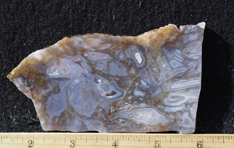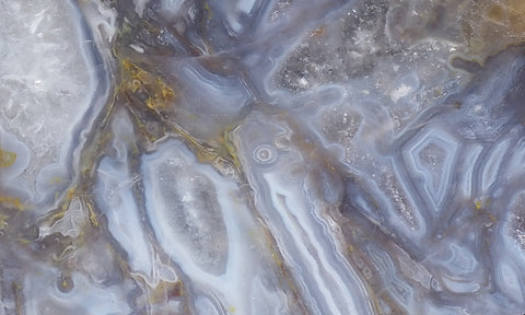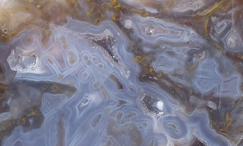 Durango Blue Agate was a new introduction from Mexico at the 2024 Tucson Rock Show.  It is characterized by its soft blue/lavender or pink hues and its multitude of tubular and lacey inclusions, as well as beautiful drusy pockets.  This agate will make extraordinary jewelry pieces and will finish with a superior polish.