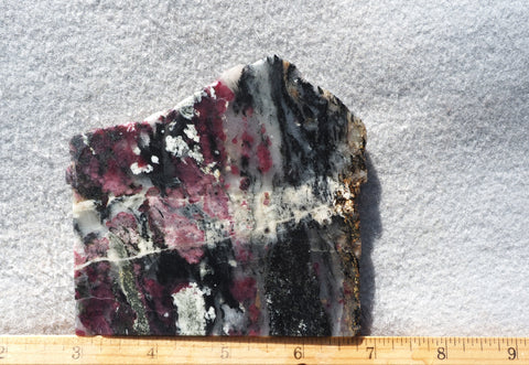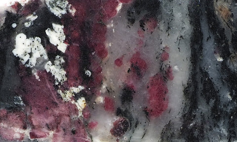 Sourced from Sweden, Eudialyte is a rare mineral that features bold pink to deep magenta hues contrasted with black, gray, and white tones. It is an uncommon ore of zirconium and the titular member of the cyclosilicate eudialyte group. Because of its rarity, Eudialyte's exact chemical composition is hard to pin down but it is associated with aegrine and calcite crystals. Its name translates to “well decomposable” in Greek, which is an allusion to its solubility in acids.