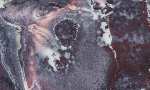 Exotic jasper is a very unique porcelain jasper from Mexico. Also known as sci-fi jasper due to its eerie, red/pink/lavender distorted orbs, this very fine grained jasper has much the same characteristics as fine porcelain and makes a superb cabbing material. It takes a high polish with ease and is relatively easy to work.
