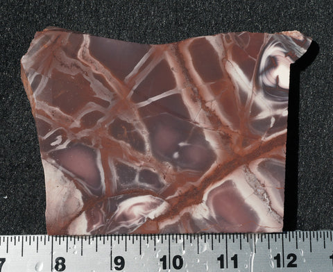 Exotic jasper is a very unique porcelain jasper from Mexico. Also known as sci-fi jasper due to its eerie, red/pink/lavender distorted orbs, this very fine grained jasper has much the same characteristics as fine porcelain and makes a superb cabbing material. It takes a high polish with ease and is relatively easy to work.