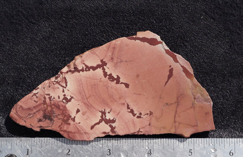 An ambitious group of rock miners recently revisited the Fire Ledge collecting site near Fallon, Nevada and brought some fabulous material back to the lapidary market. The jasper deposit is located in the area of the Dead Ringer and Mescalero claims. Patterned similar to Mimbres from Mexico, or Apache Canyon from New Mexico it features striking red/maroon dendrites on a backdrop of pink and gold. It produces outstanding scenic cabs and takes a beautiful polish. The site is due to be closed down soon, because of the military presence in the area, so grab some while you can.