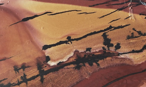 Indian Paint Rock, a Rhyolite with Hematite, from California is a rare and highly collectable scenic material displaying unique patterns of black, brown, red, tan and gray. This material comes from an area in Death Valley that is no longer producing as the mining location is now within the National Park boundary and nothing can be taken even by the casual rockhound. The material makes beautiful scenic cabs and will finish with a nice satin luster.