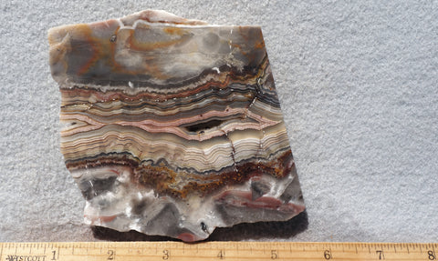 A magnificent specimen slab of Laguna Lace agate from Mexico.  Known for its bright, fortification pattern primarily white and gray it is often times highlighted with reds, pinks or raspberry color.
