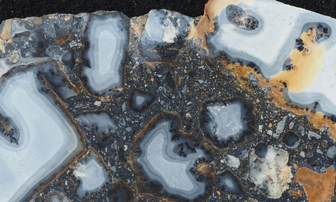 Maligano Jasper from Indonesia made its appearance to the lapidary market about a year ago. A very unusual brecciated jasper in shades of oranges, blues and gray showcases distinctive jasper scenes and occasionally includes a field of dendrites. The material may have some pits and healed fractures but the effort involved in isolating a splendid scene for a cabochon is well worth the effort.