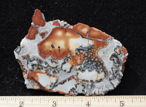 Maligano Jasper from Indonesia made its appearance to the lapidary market about a year ago. A very unusual brecciated jasper in shades of oranges, blues and gray showcases distinctive jasper scenes and occasionally includes a field of dendrites. The material may have some pits and healed fractures but the effort involved in isolating a splendid scene for a cabochon is well worth the effort.