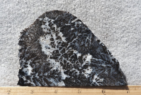 Medicine Bow plume agate comes from southeastern Wyoming, just west of Laramie, and is renowned for its sweeping black dendrites on a white agate field. Known worldwide as one of the premium dendritic agates, it is a definite asset to a complete collection and is highly valued for its cabbing characteristics. The varied dendritic pattern in each slab will make unique and strikingly beautiful cabs for jewelry.