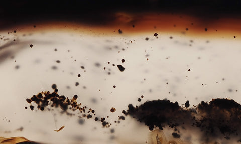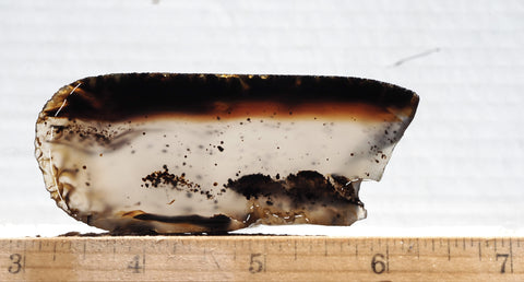 Montana agate has been a long time favorite of the lapidary enthusiast. Found in the alluvial gravels of the Yellowstone River in eastern Montana it has been collected and worked as a semiprecious stone for nearly a century. Noted for its clarity as well as its characteristic isolated black, and occasionally bright red dendrites, it makes excellent cabbing material. The majority of Montana agate pieces show a well-defined fortification pattern of black and brown as well as bright red/orange. There are also variations of filament and tube patterns and a small percentage display an “iris” band in which minute, regularly spaced layers act as a diffusion grating and, like a prism, break light into a rainbow of color. It is a relatively easy material to work with, being quite hard, and takes a brilliant polish.