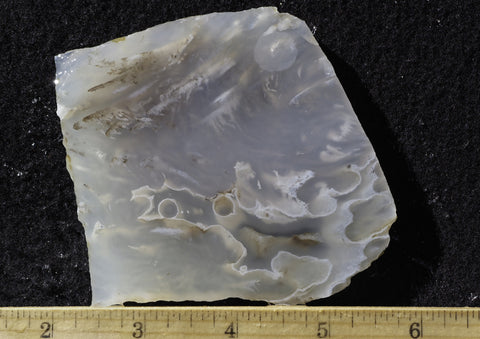A translucent to milky agate which is beautiful, even without a great variety of color as it contains soft white ghosting fortifications or overlapping tube structures with creamy brown centers. It is a solid agate that takes an excellent polish. It makes beautiful jewelry especially when formed into doublets using lapis, red jasper or obsidian for a backing, which accentuates the inclusions.