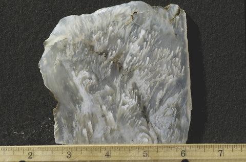 A translucent to milky agate which is beautiful, even without a great variety of color as it contains soft white ghosting fortifications or overlapping tube structures with creamy brown centers. It is a solid agate that takes an excellent polish. It makes beautiful jewelry especially when formed into doublets using lapis, red jasper or obsidian for a backing, which accentuates the inclusions.