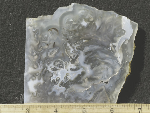 A translucent to milky agate which is beautiful, even without a great variety of color as it contains soft white ghosting fortifications or overlapping tube structures with creamy brown centers. It is a solid agate that takes an excellent polish. It makes beautiful jewelry especially when formed into doublets using lapis, red jasper or obsidian for a backing, which accentuates the inclusions.