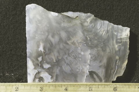 A translucent to milky agate which is beautiful, even without a great variety of color as it contains soft white ghosting fortifications or overlapping tube structures with creamy brown centers.  It is a solid agate that takes an excellent polish.  It makes beautiful jewelry especially when formed into doublets using lapis, red jasper or obsidian for a backing, which accentuates the inclusions.