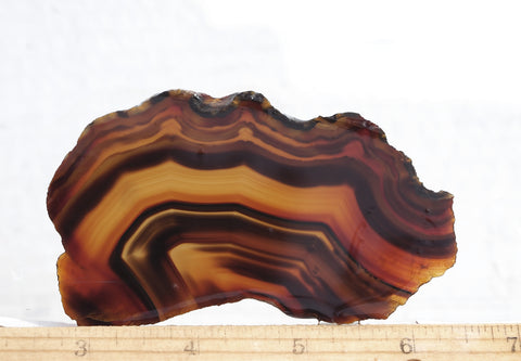 Brazilian agate has been a staple of the lapidary community for many decades. It comes in a variety of forms, the most common being a banded fortification, as well as a wide variety of colors, which adds to its universal appeal to the collector. Piranha Agate is a less common and a more desirable variety or subclass of Brazilian Agate. It is known and valued for its vivid color and high contrasting fortification bands.
