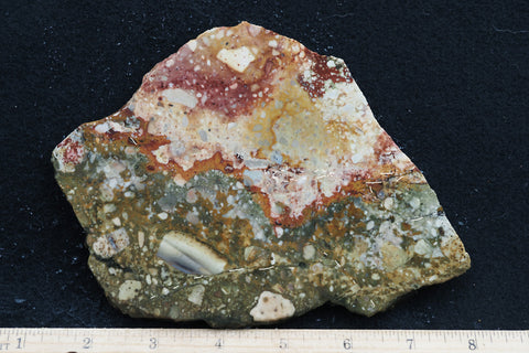 Rocky Butte is a distinctive Owyhee jasper noted for its cobweb markings and mottling. The colors are typically vivid bright greens, reds, blues and yellows.