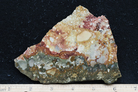 Rocky Butte is a distinctive Owyhee jasper noted for its cobweb markings and mottling. The colors are typically vivid bright greens, reds, blues and yellows.