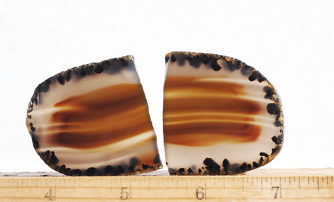 Montana agate has been a long time favorite of the lapidary enthusiast. Found in the alluvial gravels of the Yellowstone River in eastern Montana it has been collected and worked as a semiprecious stone for nearly a century. Noted for its clarity as well as its characteristic isolated black, and occasionally bright red dendrites, it makes excellent cabbing material. The majority of Montana agate pieces show a well-defined fortification pattern of black and brown as well as bright red/orange. There are also variations of filament and tube patterns and a small percentage display an “iris” band in which minute, regularly spaced layers act as a diffusion grating and, like a prism, break light into a rainbow of color. It is a relatively easy material to work with, being quite hard, and takes a brilliant polish.