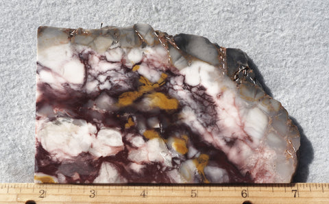 Sierra Sunset is a small deposit of new jasper out of Sierra County New Mexico. It is a very hard material and takes a good polish. The colors and patterns vary greatly; some are bold with deep orange, gold, red and purple while others are beautiful displays of soft pastel pinks and purple. Sierra Sunset provides a wide array of exciting cabbing material.