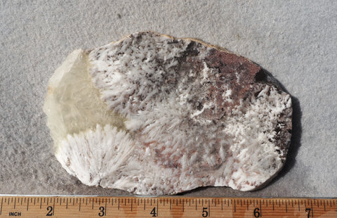 Snowflake Laguna from Mexico was a new introduction at the 2024 Quartzsite Rock and Gem Shows. This quartz and barite composite, that was layered between the Laguna Lace and Mimbres deposits, showcases a variety of delicate and intricate snowflake patterns. The material is prone to drusy pockets and pitting that can either be worked around or included in the cabochon design. The barite portion of the rock is about a 4 - 5 on the Mohs scale so it is a bit soft but still is easy to work with and held up well through the polishing process.