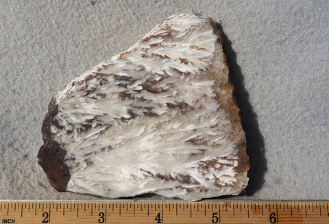 Snowflake Laguna from Mexico was a new introduction at the 2024 Quartzsite Rock and Gem Shows. This quartz and barite composite, that was layered between the Laguna Lace and Mimbres deposits, showcases a variety of delicate and intricate snowflake patterns. The material is prone to drusy pockets and pitting that can either be worked around or included in the cabochon design. The barite portion of the rock is about a 4 - 5 on the Mohs scale so it is a bit soft but still is easy to work with and held up well through the polishing process.