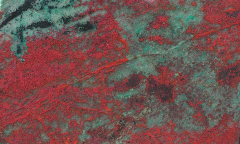 Sonora Sunrise is a highly desirable tri-color jasper out of Mexico. It is made up of Chrysocolla, which is a beautiful blue/green, and Cuprite, which is the red/orange interspersed with black iron banding. The contrast of these bold colors produces striking cabochons and is a mainstay for southwestern themed jewelry. Once plentiful, this material is increasingly difficult to obtain, especially slabs that display all three colors. This material is old stock and shows deeply saturated reds.