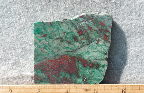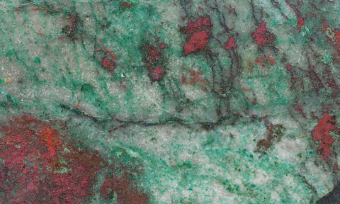 Sonora Sunrise is a highly desirable tri-color jasper out of Mexico. It is made up of Chrysocolla, which is a beautiful blue/green, and Cuprite, which is the red/orange interspersed with black iron banding. The contrast of these bold colors produces striking cabochons and is a mainstay for southwestern themed jewelry. Once plentiful, this material is increasingly difficult to obtain, especially slabs that display all three colors. This material is old stock and shows deeply saturated reds.