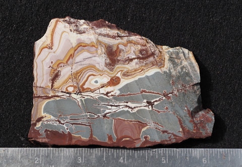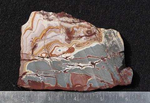 Sonoran Dendritic Rhyolite is a very popular lapidary from Mexico material that displays very bold patterns in primarily red/brown and blue/gray colors. The splendid patterns are reminiscent of a combination of Dr. Seuss and Salvador Dali captured on a rock canvas. The striking pattern produces exciting finished pieces. A must for any serious collection.