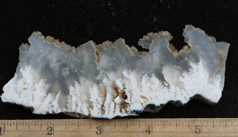 Stinking Water Plume Agate is a remarkable old agate that was discovered in the 1950s at Stinking Water Creek near Juntura, Oregon. It is distinguished by finely detailed, white feathery plumes or flames encased in translucent agate. This material makes elegant stand-alone cabs, artistic live edge pieces featuring the dainty tubules and plumes, or a cab backed with a color layer for a striking doublet.