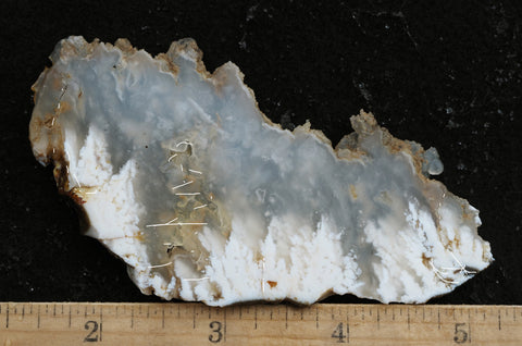 Stinking Water Plume Agate is a remarkable old agate that was discovered in the 1950s at Stinking Water Creek near Juntura, Oregon. It is distinguished by finely detailed, white feathery plumes or flames encased in translucent agate. This material makes elegant stand-alone cabs, artistic live edge pieces featuring the dainty tubules and plumes, or a cab backed with a color layer for a striking doublet.