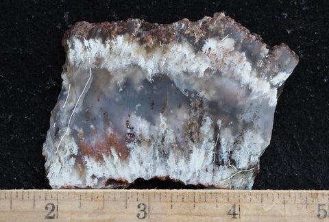 Stinking Water Plume Agate is a remarkable old agate that was discovered in the 1950s at Stinking Water Creek near Juntura, Oregon. It is distinguished by finely detailed, white feathery plumes or flames encased in translucent agate. This material makes elegant stand-alone cabs, artistic live edge pieces featuring the dainty tubules and plumes, or a cab backed with a color layer for a striking doublet.
