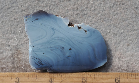 Superior Swirl/Pioneer Swirl slag glass is a very unique lapidary material, from upper peninsula of Michigan, which displays a subtle play of swirling patterns in multiple shades of blue. It is technically a glassy slag left from a copper smelting mining process that was active throughout the 1800 – 1900”s. There are multiple collecting sites for similar material; Leeland Blue from the lower peninsula, Sieber Agate from Germany, and Swedish Blue. It characteristically contains numerous pinhead sized vesicles and works up much the same as obsidian. It produces distinctive cabs ideal for that “special” finished piece.