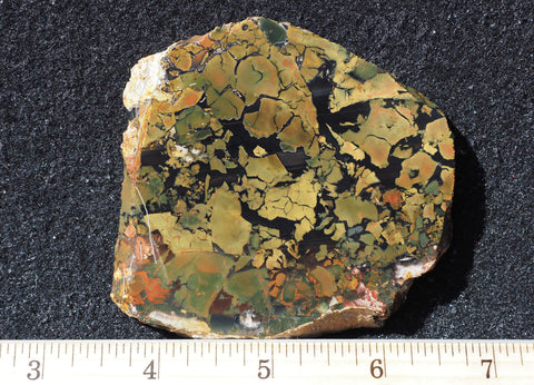 Whiskey Creek Jasper was initially discovered in 2000 on the Idaho side of the Owyhees, but it wasn’t until 2021 that through a coordinated mining effort the deposit became a reality and produced enough to be introduced at the January 2023 Quartzsite PowWow. Some of the jasper has characteristics very much like orbed Black Bruneau while other has a wildly brecciated pattern; both of which display rich earth tones in oranges, yellow, reds, greens, and browns. This material is super hard and will take an exceptional polish creating impressive cabs or display pieces. The material was in high demand and quickly sold out.