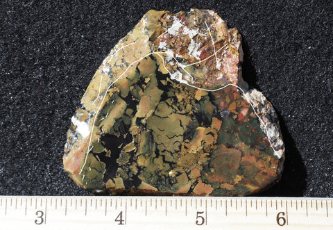 Whiskey Creek Jasper was initially discovered in 2000 on the Idaho side of the Owyhees, but it wasn’t until 2021 that through a coordinated mining effort the deposit became a reality and produced enough to be introduced at the January 2023 Quartzsite PowWow. Some of the jasper has characteristics very much like orbed Black Bruneau while other has a wildly brecciated pattern; both of which display rich earth tones in oranges, yellow, reds, greens, and browns. This material is super hard and will take an exceptional polish creating impressive cabs or display pieces. The material was in high demand and quickly sold out.