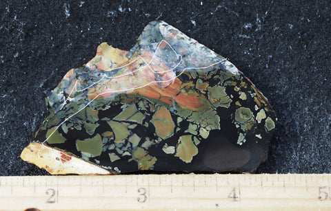 Whiskey Creek Jasper was initially discovered in 2000 on the Idaho side of the Owyhees, but it wasn’t until 2021 that through a coordinated mining effort the deposit became a reality and produced enough to be introduced at the January 2023 Quartzsite PowWow. Some of the jasper has characteristics very much like orbed Black Bruneau while other has a wildly brecciated pattern; both of which display rich earth tones in oranges, yellow, reds, greens, and browns. This material is super hard and will take an exceptional polish creating impressive cabs or display pieces. The material was in high demand and quickly sold out.