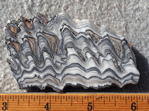 Zebra Onyx, the common name given to this calcite mineral, is primarily sourced from Mexico. The stone is known for its black and white color and unique banded patterns. The banding is a result of alternating layers of black and white calcite on top of each other. The starkly contrasting, swirling patterns and intricate dendrites will make attention grabbing cabs.
