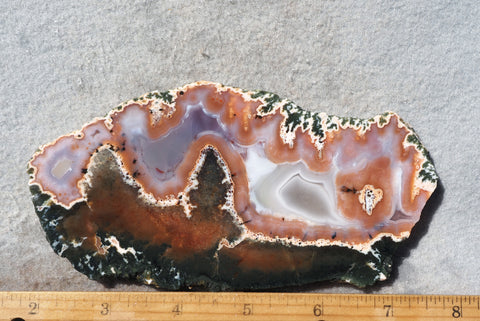 Berber agate is a unique material from Morocco. Known for its bright salmon orange/red color, it is usually accompanied with a white/gray background that many times displays a tight fortification pattern. It produces many unusual patterns and unique “needle” inclusions that makes for a great variety of finished pieces. Berber agate makes great cabbing stock….easy to polish with a wide variety of color and pattern.