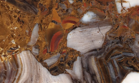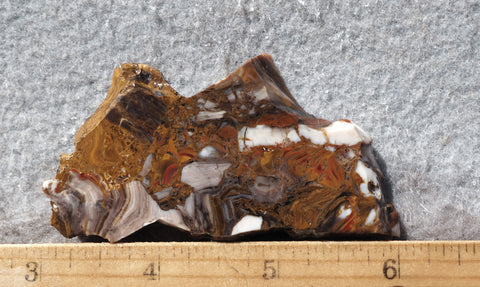 Biggs Flame, a new material out of the Biggs Jasper area, formed as a vented rhyolite and contains brilliant red flames and small spots of opal. As the mineral filled steam vents solidified the contents created colorful and distinct wood-grained patterns. The black certainly sets off the red flame in spectacular fashion. The material can be difficult to work with as it is brittle and has some fracturing to contend with, however, the finished products will take a great polish and produce highly desirable cabs.