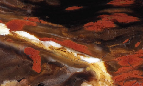 Biggs Flame, a new material out of the Biggs Jasper area, formed as a vented rhyolite and contains brilliant red flames and small spots of opal. As the mineral filled steam vents solidified the contents created colorful and distinct wood-grained patterns. The black certainly sets off the red flame in spectacular fashion. The material can be difficult to work with as it is brittle and has some fracturing to contend with, however, the finished products will take a great polish and produce highly desirable cabs.