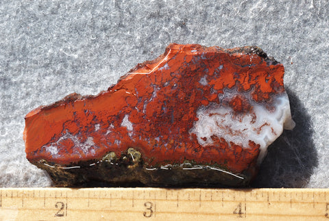 Brenda agate/jasper from Arizona has been a favorite of the lapidary artist for many years. Noted for its intense red jasper, often paired with a milky white accent agate, it cuts some very remarkable cabs. Many times the material is filled with druzy pockets that make excellent open cabs or free forms. It takes an excellent polish and makes a wonderful addition to any collection.