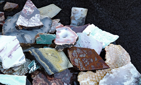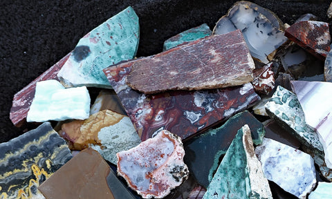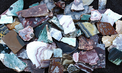 Money saving bulk tumbling and small cab mix. This 10+ pound bag of lapidary material includes a large variety of agate and jasper pieces suitable for tumbling and or small cabochons. The pieces are seconds that did not pass quality standards for solo store listings. They include small slabs, end cuts, pieces with fractures or pits, thin or tapered cuts, and an occasional miscut chunk. Each collection promises a kaleidoscope of colored and patterned usable lapidary material.