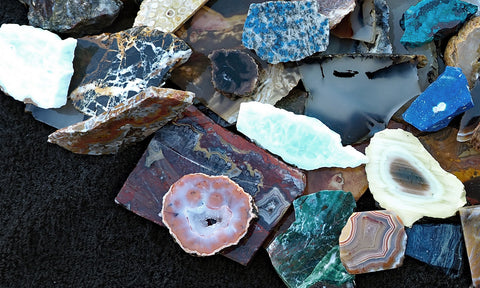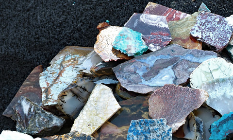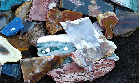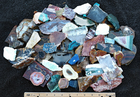 Money saving bulk tumbling and small cab mix. This 10+ pound bag of lapidary material includes a large variety of agate and jasper pieces suitable for tumbling and or small cabochons. The pieces are seconds that did not pass quality standards for solo store listings. They include small slabs, end cuts, pieces with fractures or pits, thin or tapered cuts, and an occasional miscut chunk. Each collection promises a kaleidoscope of colored and patterned usable lapidary material.