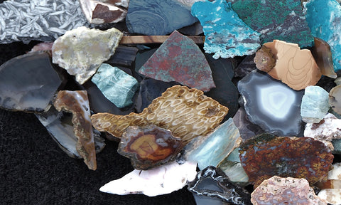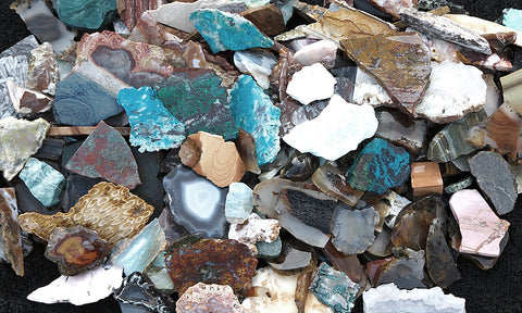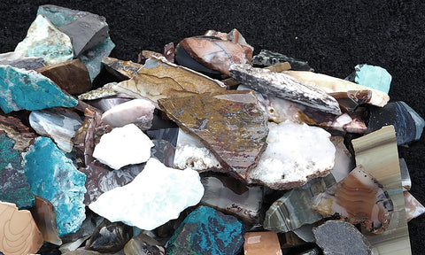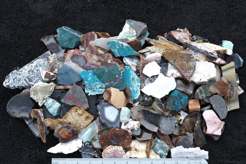 Money saving bulk tumbling and small cab mix. This 10+ pound bag of lapidary material includes a large variety of agate and jasper pieces suitable for tumbling and or small cabochons. The pieces are seconds that did not pass quality standards for solo store listings. They include small slabs, end cuts, pieces with fractures or pits, thin or tapered cuts, and an occasional miscut chunk. Each collection promises a kaleidoscope of colored and patterned usable lapidary material.